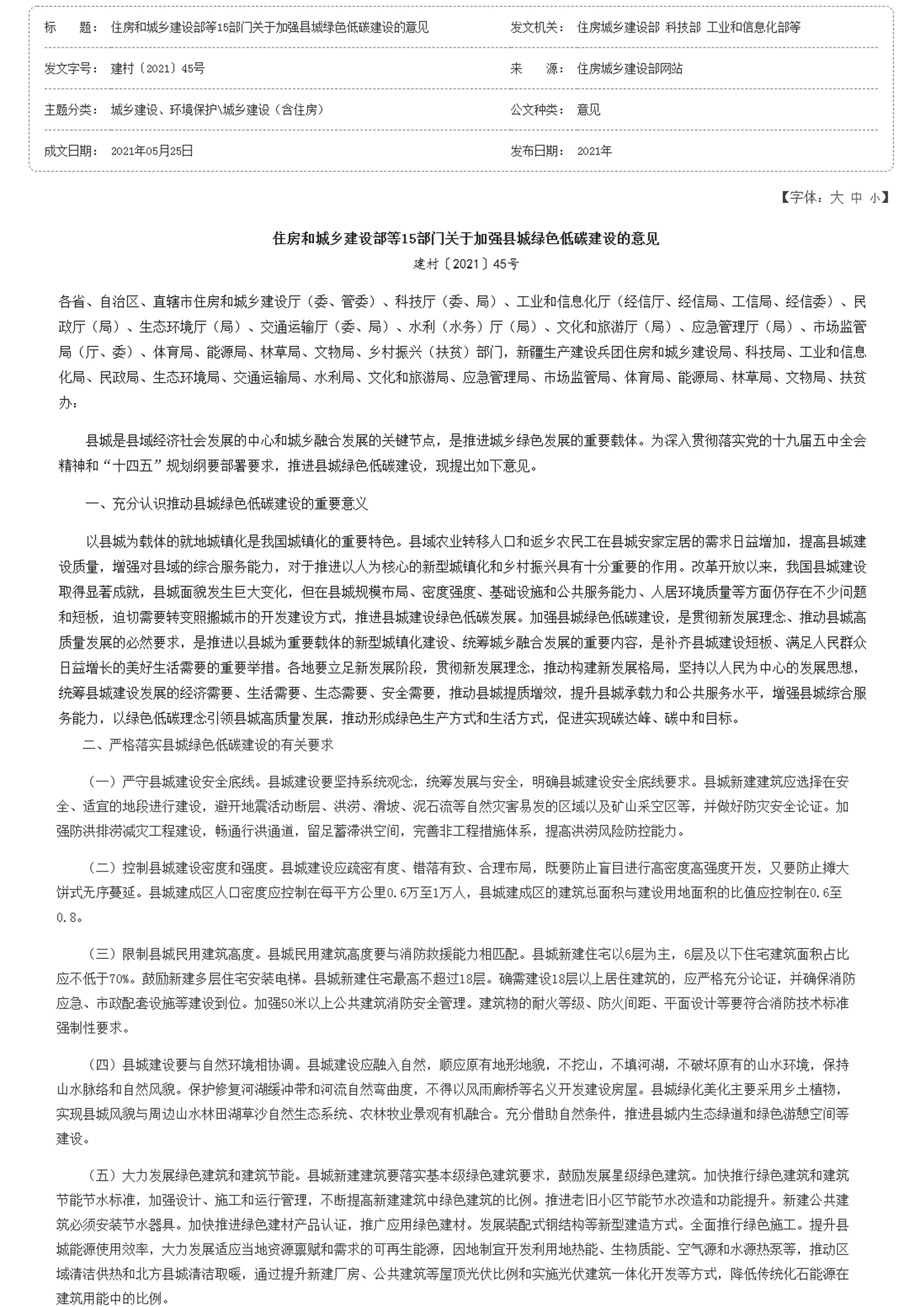 近日,國家住房和城鄉建設部、科技部、工業和信息化部、生態環境部、市場監管總局、鄉村振興局等15部門發布《關于加強縣城綠色低碳建設的意見》。